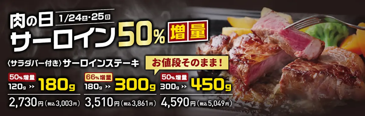 対象となるのは「サーロインステーキ」。一頭の牛の中でも特に甘みとやわらかさを持つ人気部位である。この肉の日では、通常サイズから50〜66%の増量で提供される。