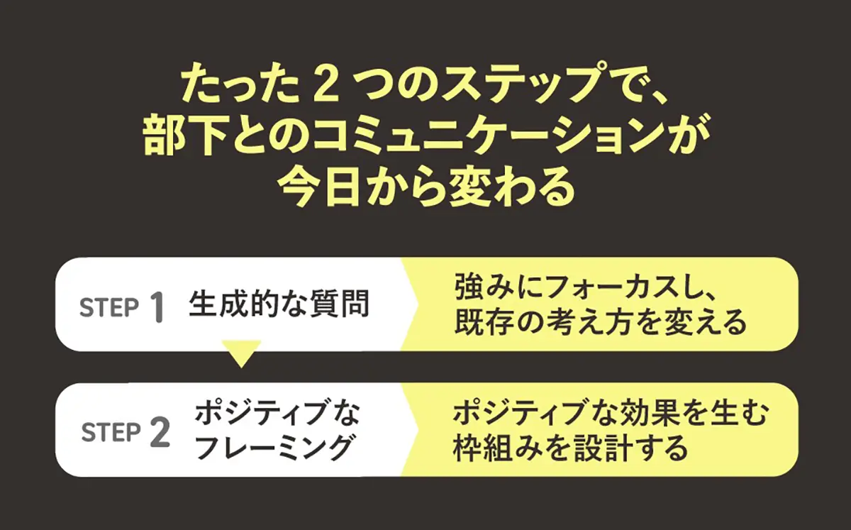 何が間違っていたのかを問い続けるのではなく、何がうまくいったのか、どんな可能性があるのかを引き出す。そのために必要なのが「生成的な質問」と「ポジティブなフレーミング」という2つの実践法である。問いかけ方を変えれば思考が変わり、行動が変わり、組織全体が今日から動き出す。