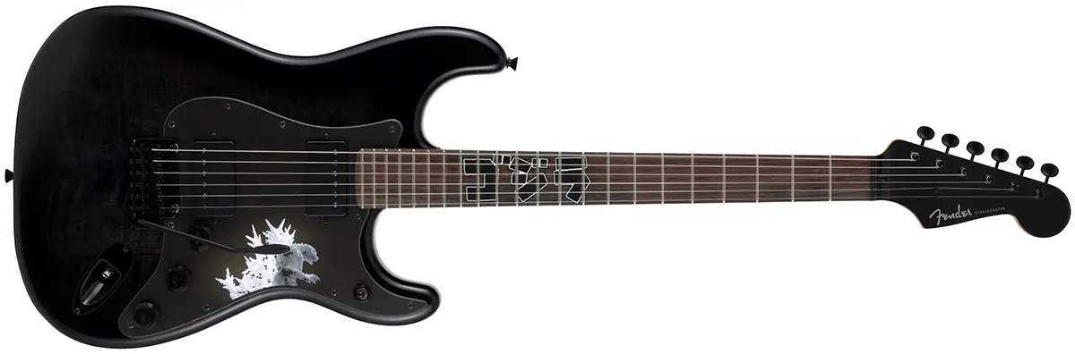 一方、ブラックモデルはFender Flagship Tokyoとフェンダー日本公式オンラインショップ限定で発売される。1作目の白黒映画『ゴジラ』の世界観にインスパイアされたモノトーンデザインで、より限定性の高いモデルとなっている。こちらはシリアルナンバー入りの特別仕様ネックプレートが付属し、コレクション性も高い。