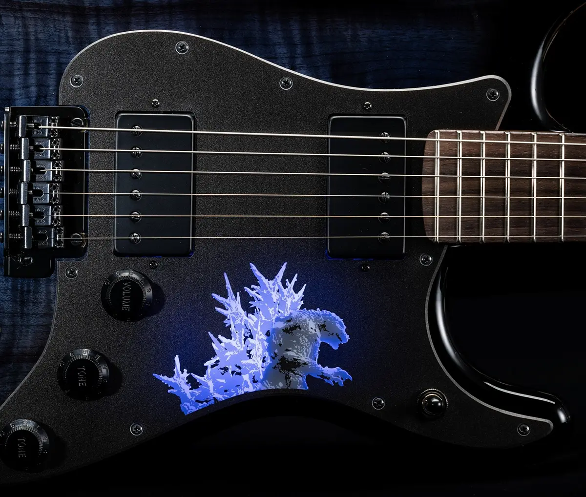 注目すべきは「GLO – Gain-Linked Optics」機構(特許出願中)だ。Tone 2ノブを押すと内蔵ディストーション回路が作動し、歪みの度合いに応じて光の強さが変化する。演奏に合わせてピックガードに描かれたゴジラの背びれが発光し、怒れるゴジラが放射熱線を放つ姿を音と光で表現するという。ライブステージでの演出効果は絶大だろう。