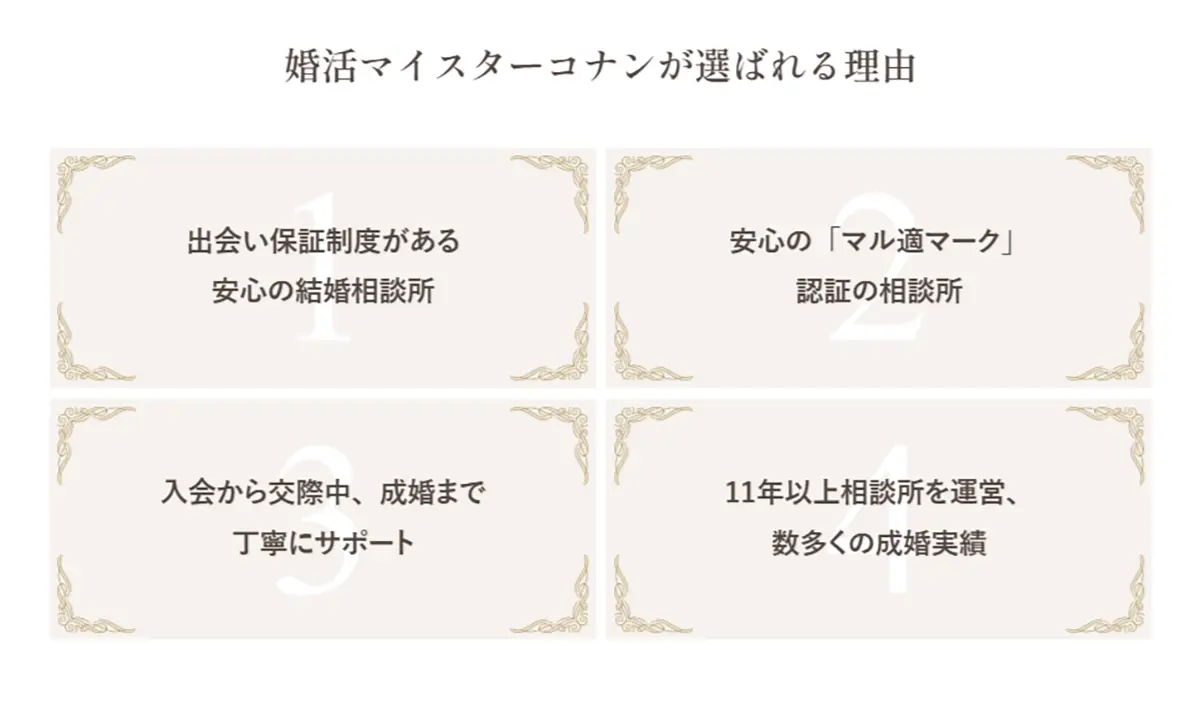 「婚活マイスターコナン」は、全国約4,000社が加盟する日本結婚相談所連盟(IBJ)において、「IBJアワード」を9期連続受賞している。このアワードは、成婚実績や会員サポート体制など、結婚相談所の総合力を評価するものだ。継続的に受賞していることは、サポート力と実績が高く評価されている証といえる。
