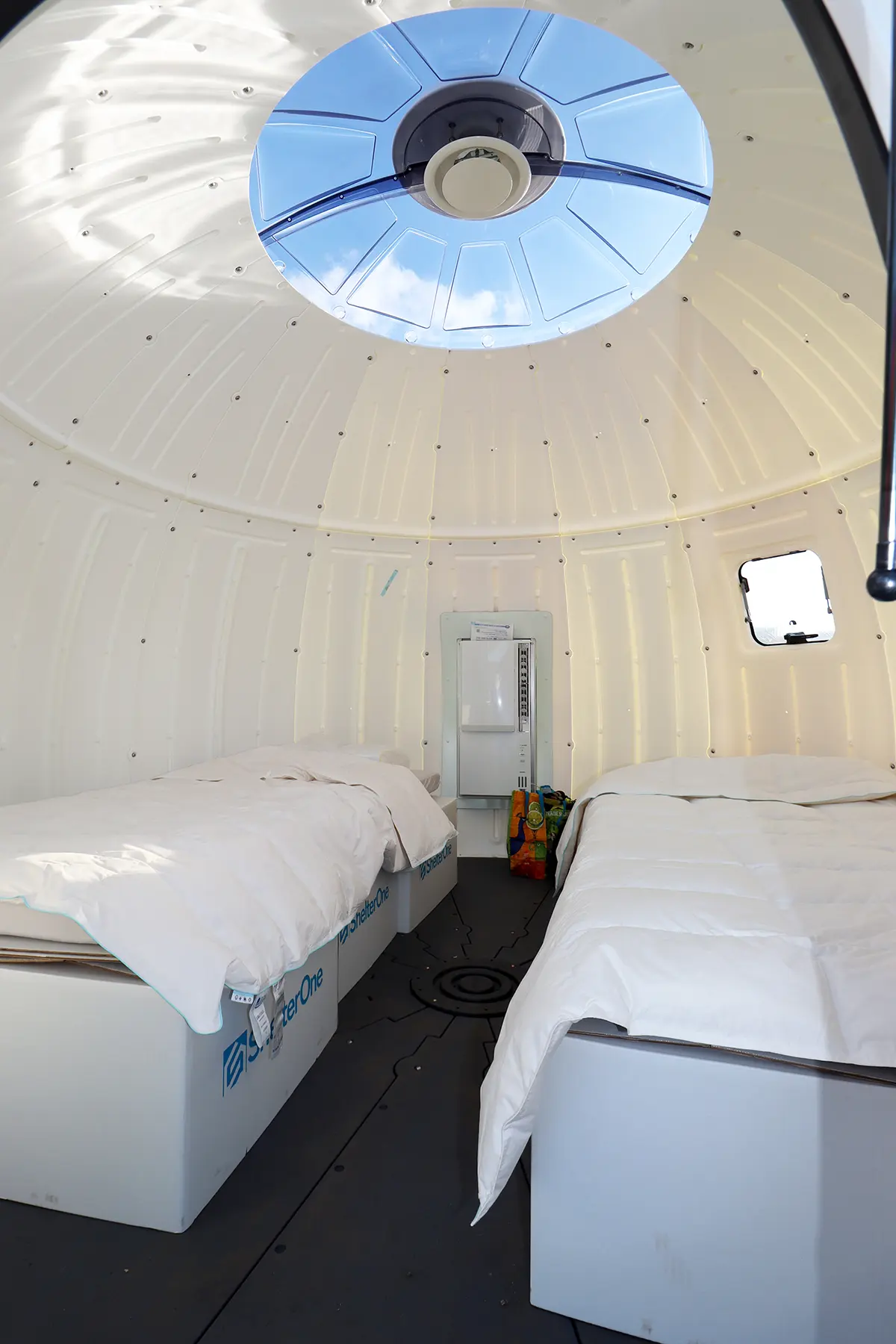 EZDOME HOUSEのドーム型デザインは、そうした従来の避難所のイメージを覆すものになっている。自然と調和する形状で、災害時の簡易住居にありがちな物々しさがない。内観も角がなく開放的で、実際のサイズは縦横3メートル、高さ2.5メートルなのだが、それ以上に広々と感じられる空間設計なのだという。