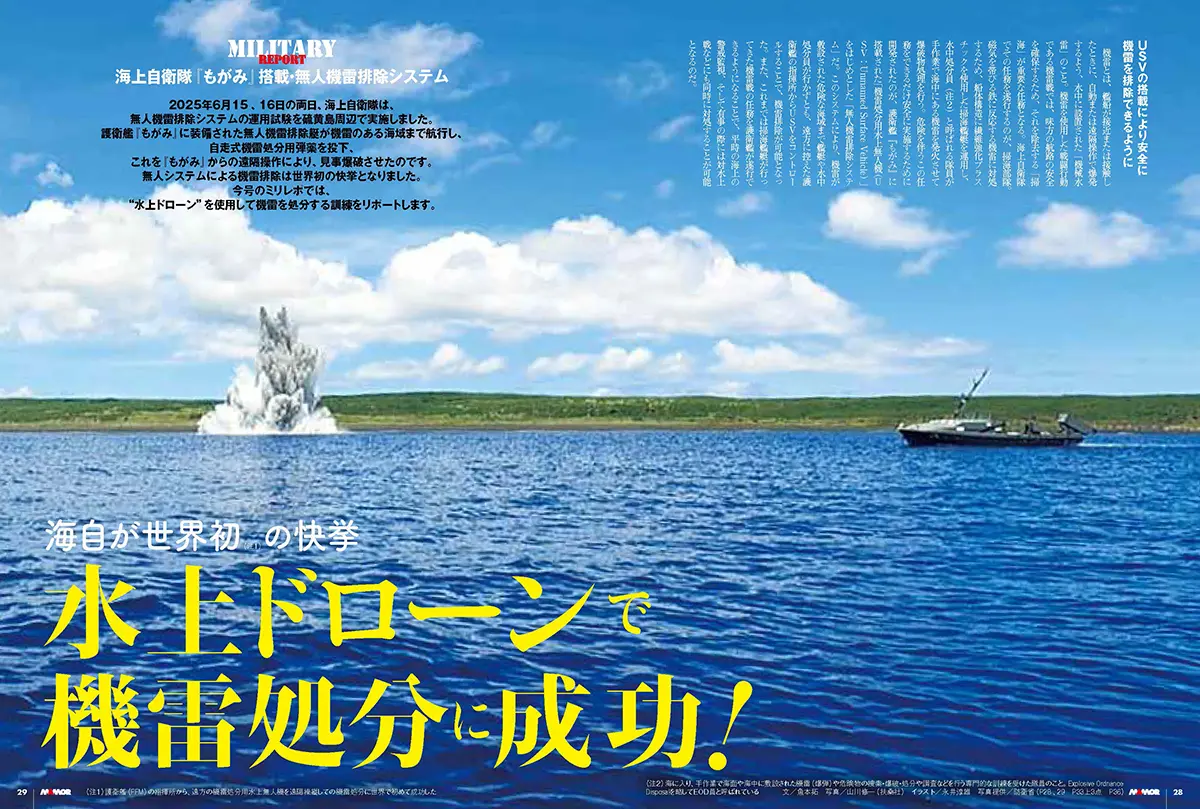 今号でもうひとつ目を引くのが、海上自衛隊の護衛艦『もがみ』に搭載された無人機雷排除システムのリポートである。