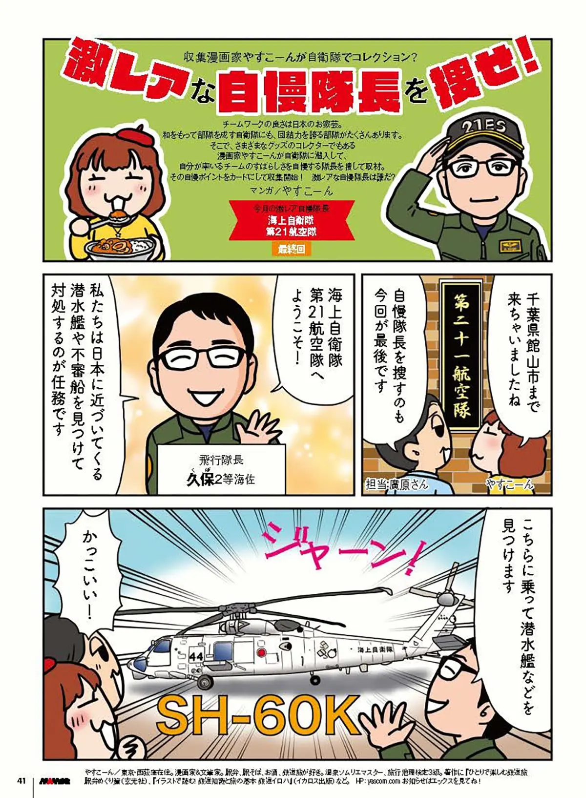 収集漫画家のやすこーんさんが自衛隊に潜入して、自分が率いるチームのすばらしさを自慢する隊長を捜す企画もユニークだ。その自慢ポイントをカードにして収集するという趣向で、「激レアな自慢隊長を捜せ!」というタイトルからして楽しそうである。チームワークの良さは日本のお家芸、と書いてあって、確かにそうだよなと思う。