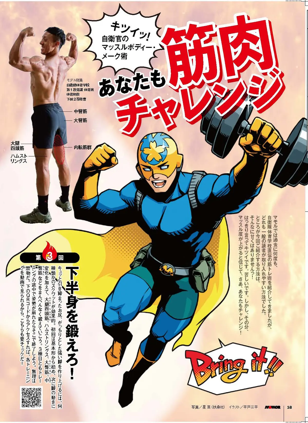 それから「あなたも筋肉チャレンジ」という企画は、自衛官の「キツイッ!」マッスルボディーメーク術を紹介するもの。「そんなに甘くはありませんっ! はっきり言ってキツイです。苦しいです」と正直に書いてあるのがいい。でも、その分マッスル度が上がると信じて、さあチャレンジ、というわけである。
