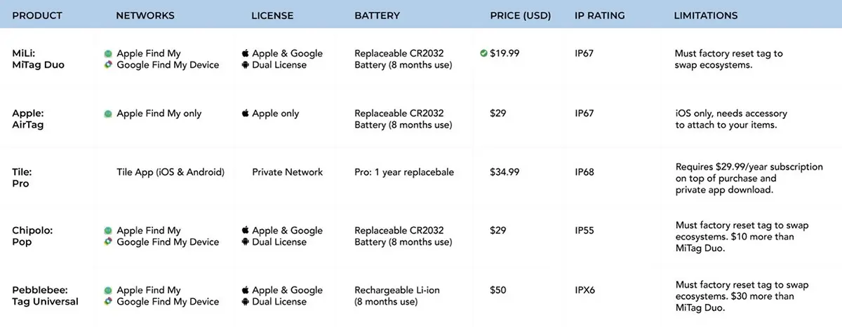 ChipoloやPebblebeeも最近、デュアルシステム対応のトラッカーを発表したが、MiLi MiTag Duoに比べて価格は割高だ。いわゆる「ユニバーサル」対応を謳う他社製品よりも低価格で、かつ機能面でも大きくリードしている。さらに、世界最大級のクラウドソース型探索ネットワークであるAppleとGoogleの両方を活用できる点も大きな強みだろう。