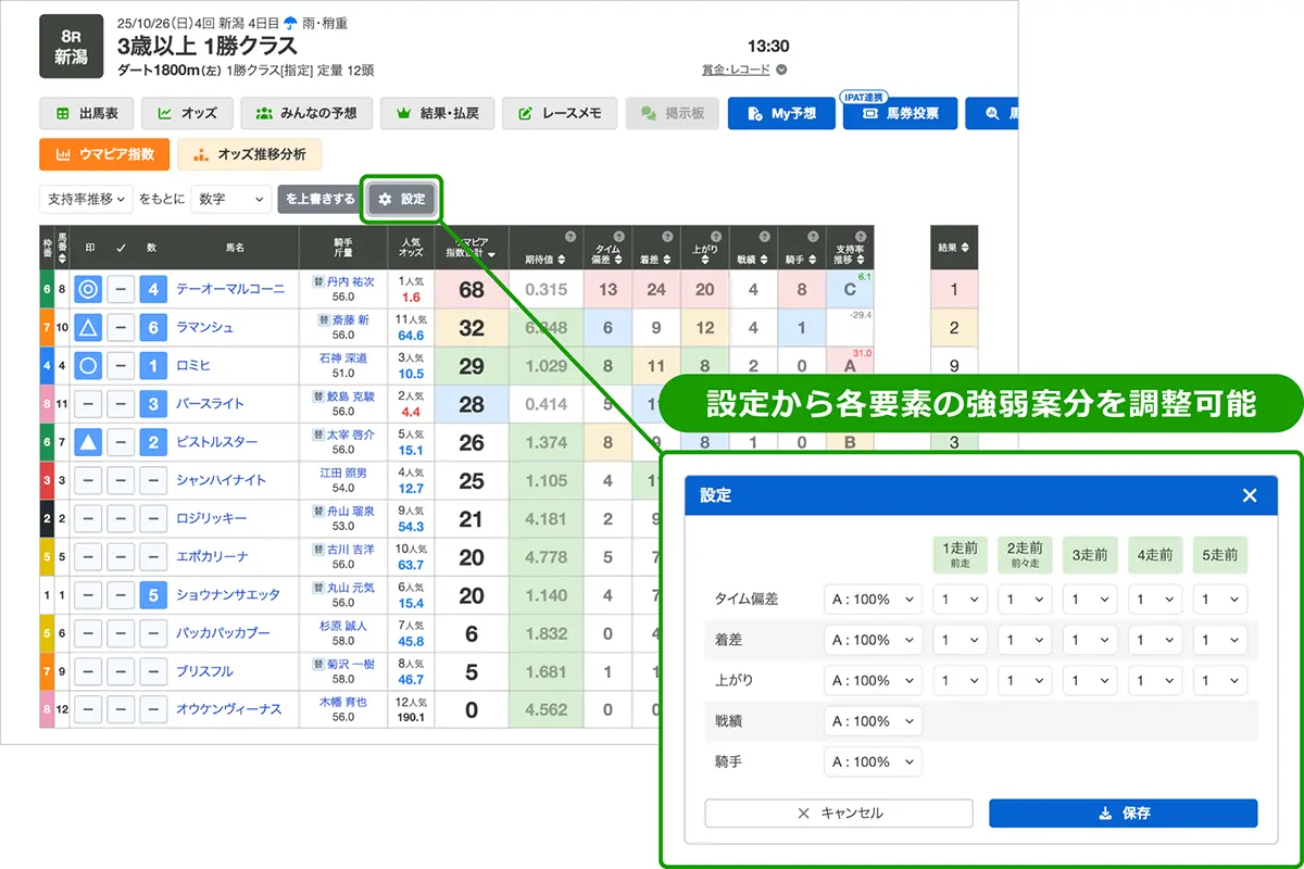 さて、ウマピアの真骨頂は何と言ってもAI予想機能だ。ただし、よくある「AIが勝手に馬券を選んでくれる」というタイプではない。ここがミソなのだが、ユーザーが事前に自分の予想ロジックを設定すると、AIがそれを学習して出馬表が確定した段階で自動的に予想を生成してくれるのである。