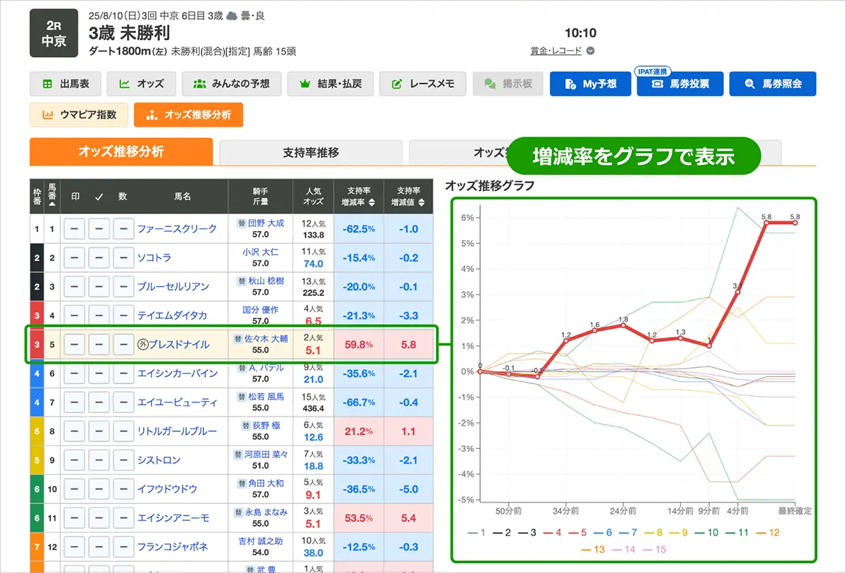 ウマピアの画面を開くとまず目に飛び込んでくるのがデジタル馬柱の見やすさである。オッズ、戦績、騎手データといった情報が一画面に集約されていて、紙の新聞のようにページをめくったり、欄外の小さな文字を目を凝らして読んだりする必要がない。気になる項目はワンクリックで強調表示できるから、まさに赤ペン感覚。いや、赤ペンよりスピーディかもしれない。