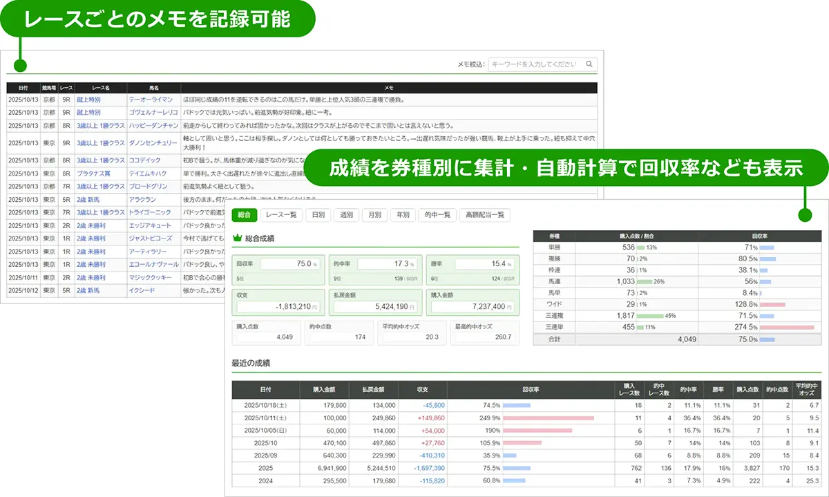 レースごとに印やチェックマーク、一言メモを記録できる「競馬ノート」機能があって、過去の予想がすべて保存される。「あのとき、なぜあの馬に◎をつけたんだっけ?」という振り返りができるのは、予想の精度を上げる上でも重要だろう。さらに、つけた印から自動で買い目を選定してくれる機能や、券種別に収支を集計する機能まである。