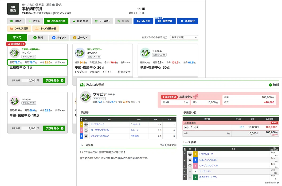 ウマピアのもうひとつの注目機能が、予想の共有とコミュニティだ。ネット上には競馬予想を公開している人が山ほどいるが、正直なところ「当たったレースだけを強調している」ケースも少なくない。回収率300%! なんて謳っていても、その計算方法が怪しかったりする。