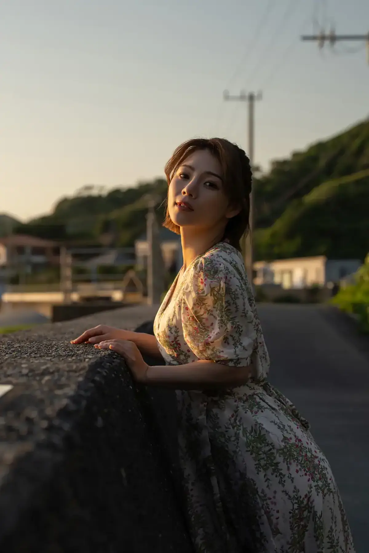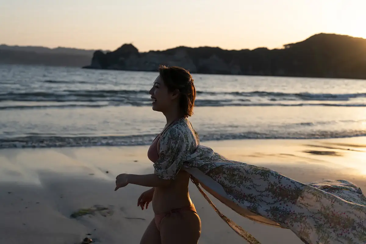 オレンジ色の夕陽に照らされた浜辺では、ビキニと花柄のガウン姿で佇むシネマティックなシーンも。遠くを見つめる横顔は、まるで映画のヒロインのようで、”女優”としての一面を強く感じさせる仕上がりらしい。