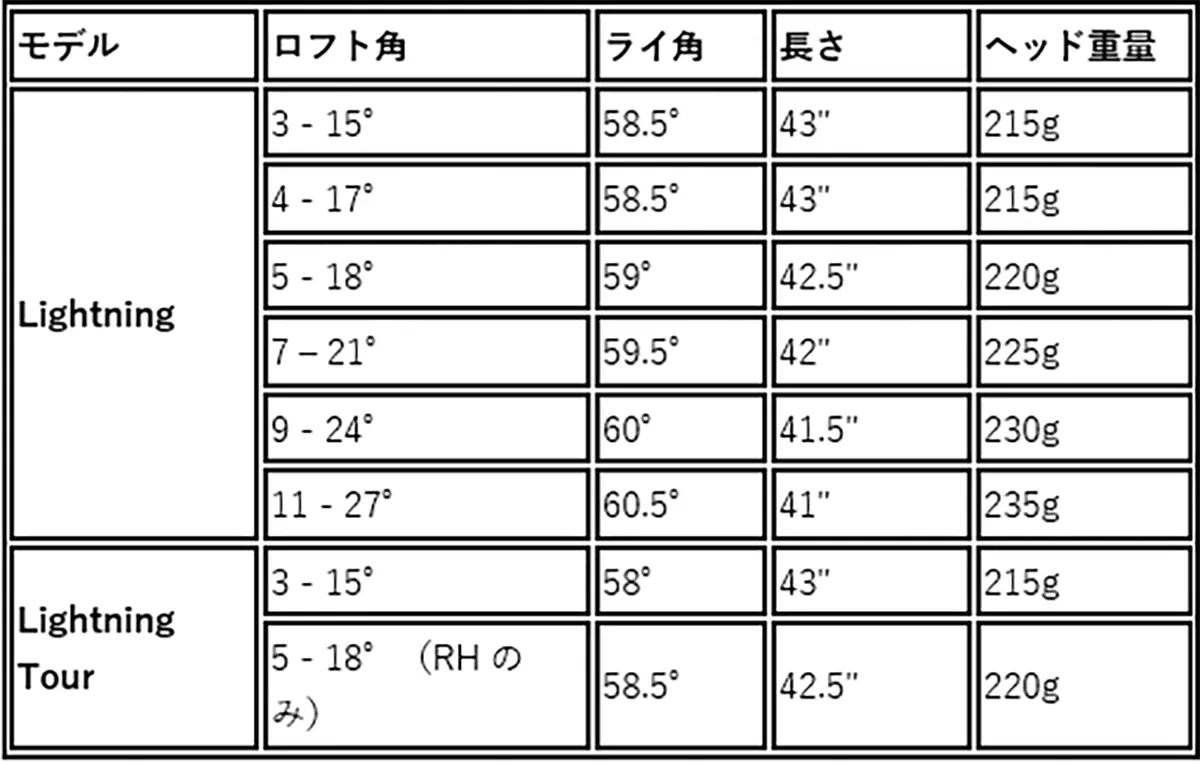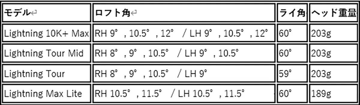 スパインドソールデザインと従来比最大84%拡大したカーボンファイバー構造により、余剰重量をヘッド周辺に配置。慣性モーメント(MOI)が高まり、ヘッドがブレにくくなる。展開モデルはLightning Tour、Lightning Tour Mid、Lightning Max-10K+、Lightning Max Liteの4種類。中でもMax-10K+はUSGA規定上限に迫る安定性を実現している。全モデルに精密ウェイト調整システムを搭載し、打ち出し角やスピン量、ドロー・フェード傾向を調整可能だ。