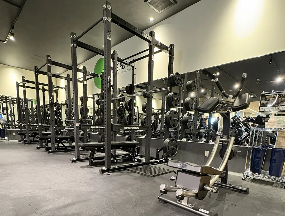 設備:有酸素マシン16台、筋トレマシン14台、 パワーラック3台、スミスマシン2台、ダンベル1㎏~50㎏、日焼けマシン1台、水素水1台、InBody1台、プロテインサーバー1台、骨盤底筋チェア1台、更衣室3室、トイレ3室、シャワー4室、駐車場39台