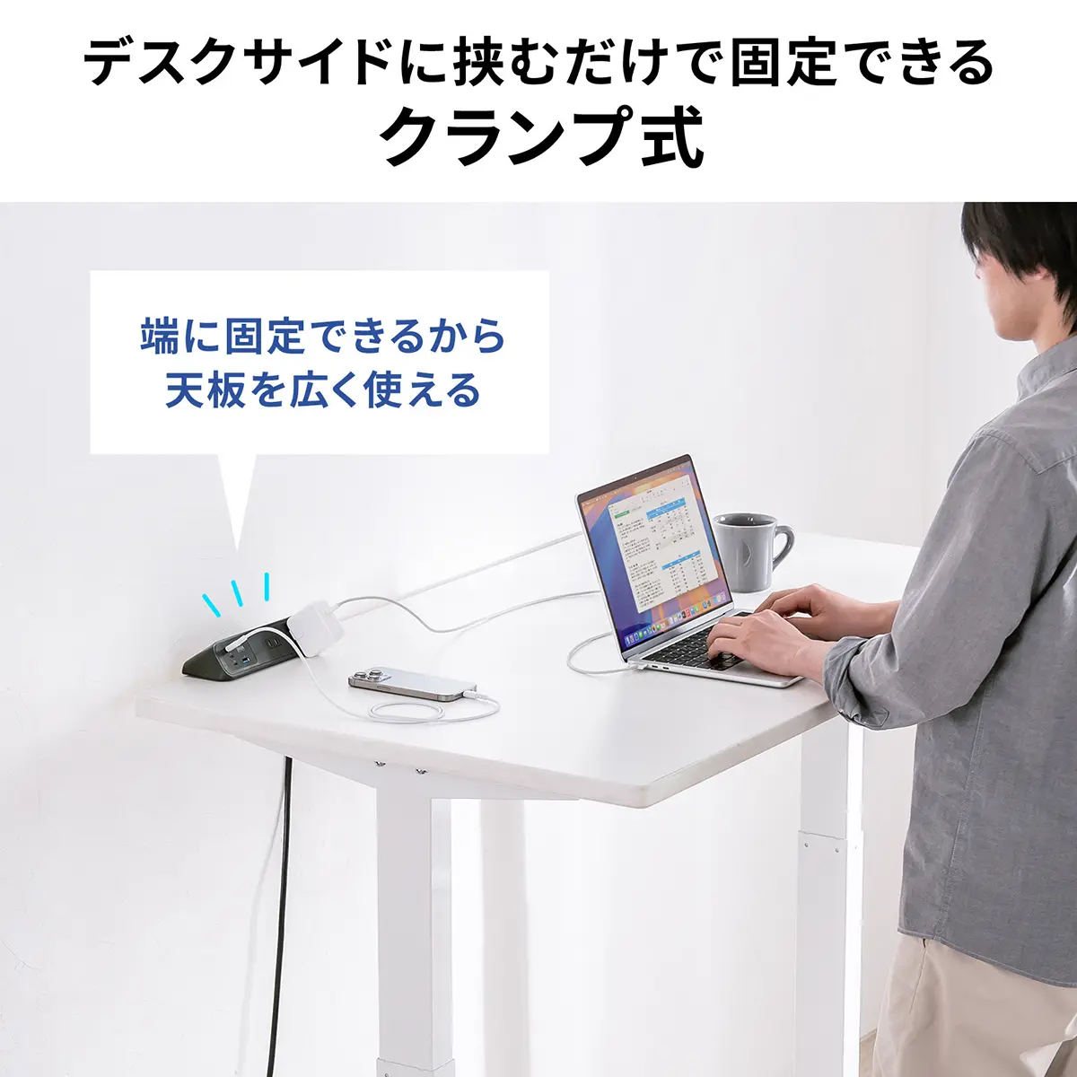この電源タップの最大の特徴は、デスクの縁にクランプで固定できること。穴を開ける必要がなく、デスク上のスペースも圧迫しない。しっかり固定されるから、足や椅子が引っかかってタップごと落下するリスクも減らせる。